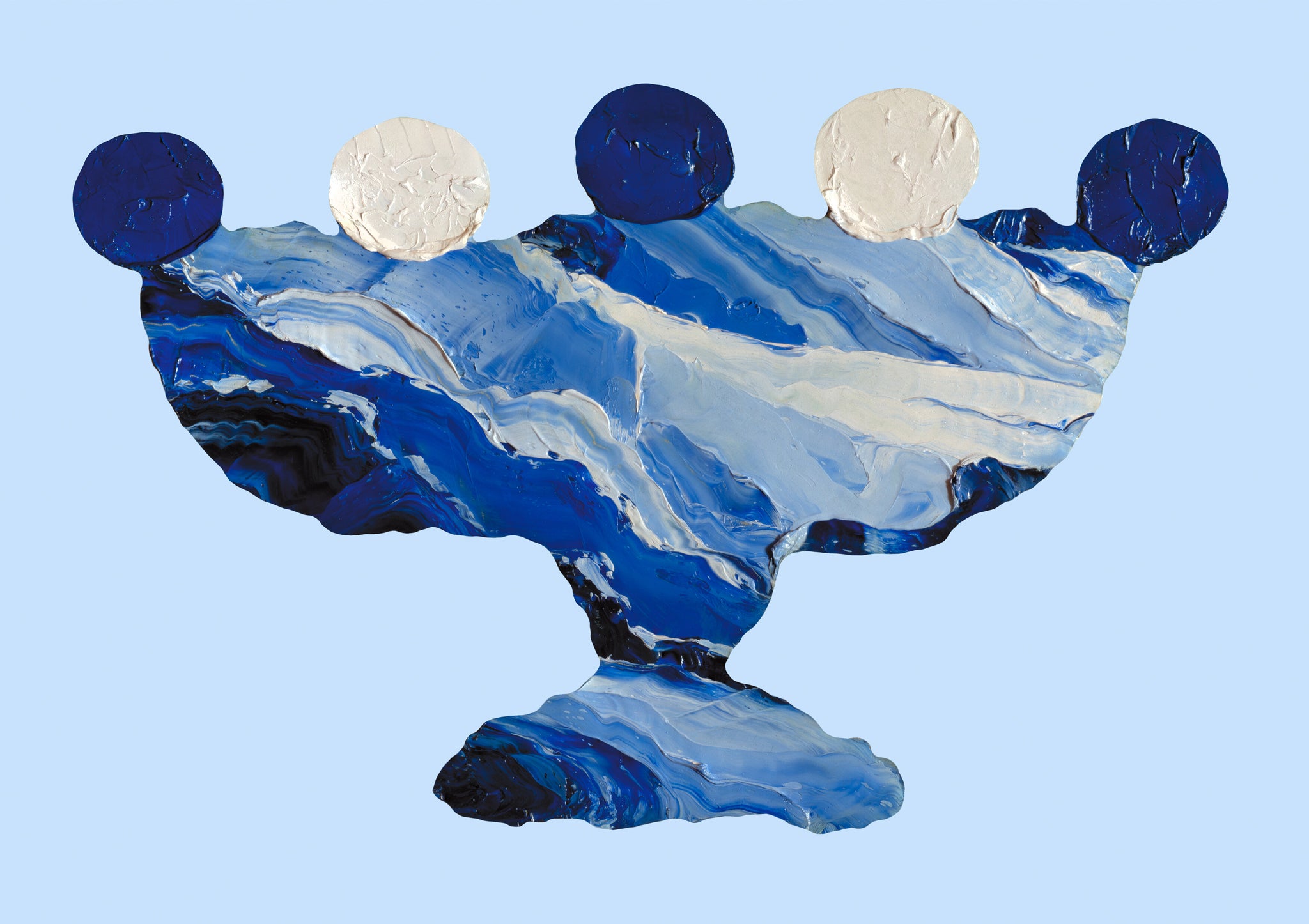 From the original oil painting Contained, Series 2, Vessel #2, 2025. Featuring an abstract landscape in the shape of a fruit bowl, on a pastel blue digitally coloured background.