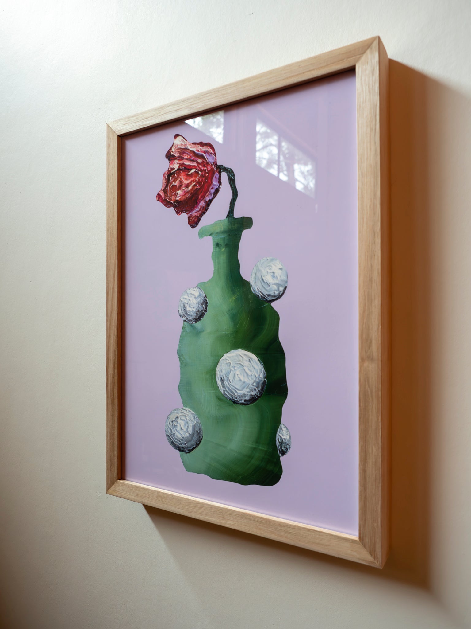 LIMITED EDITION PRINT 'Tulip, Bottle'. 10% DONATED [ Green Vase, White Balls, Red Flower, Purple Background ]